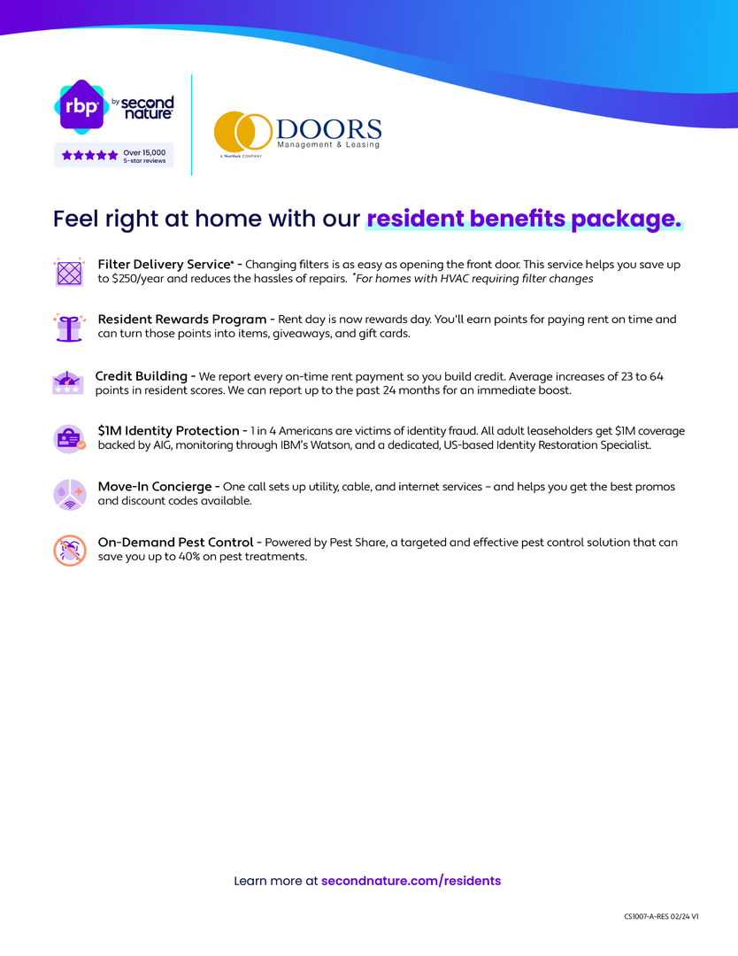 All Doors Management & Leasing properties offer an optional Resident Benefits Package (RBP) designed to simplify certain aspects of renting. Services may include utility set-up assistance, identity protection, credit-building services, rewards program, pest control, and HVAC air filter delivery, subject to property limitations.