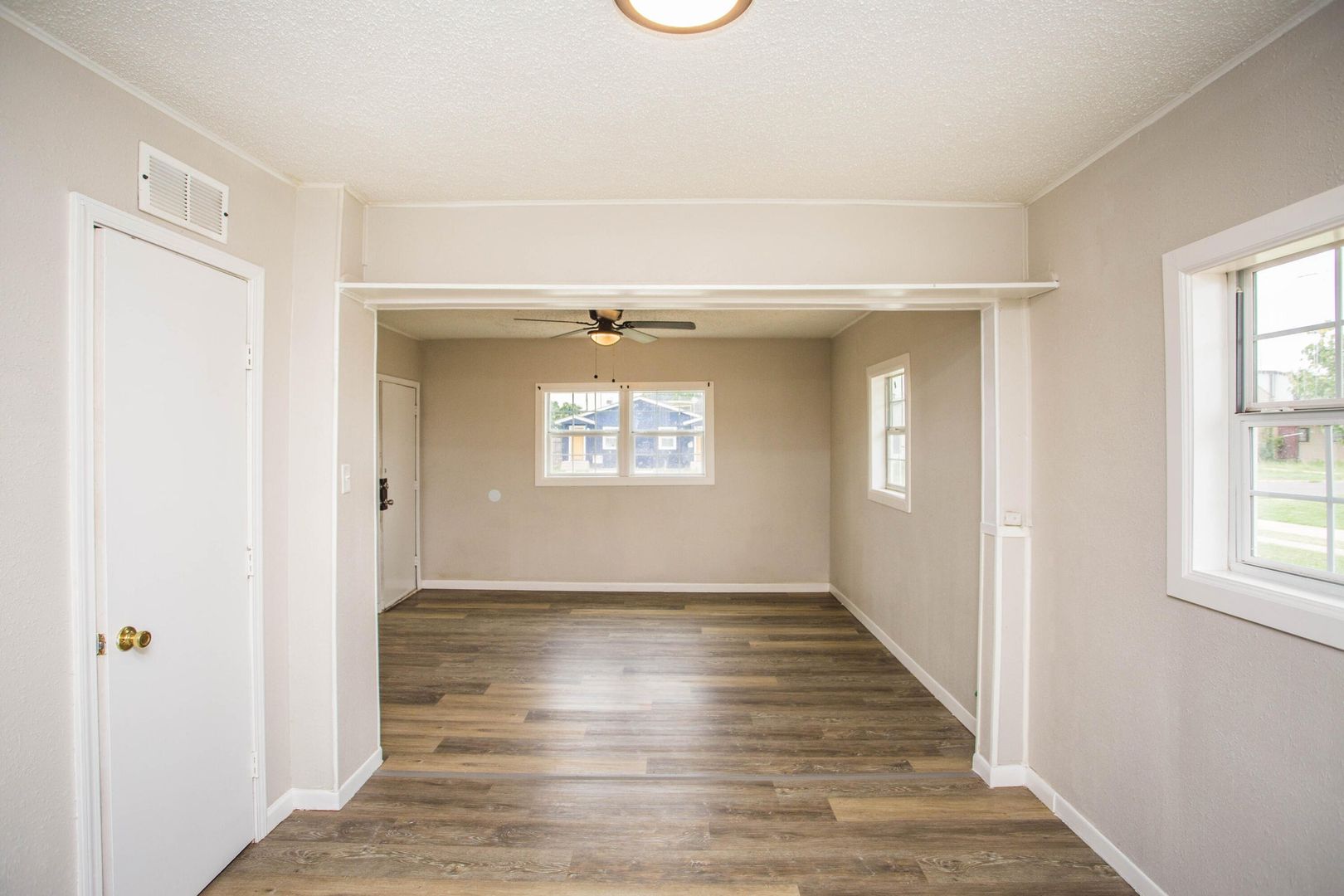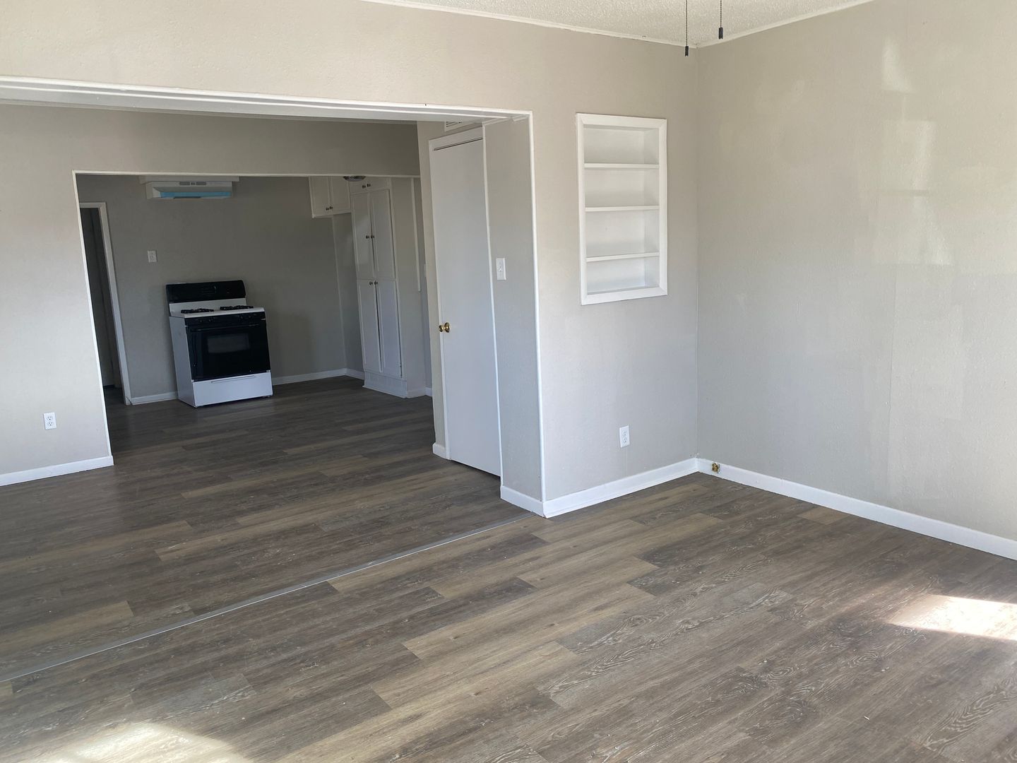 Be the first to enjoy this newly renovated two-bedroom, one-bath house. The living room offers built-in shelving for books and decorative items. Windows on two walls allow the room to be bathed in sunlight. A dining room separates the living room and kitchen, giving the home an open concept. The kitchen features an electric range, new countertops, and a pantry. Additional updates include new vinyl plank flooring throughout, freshly painted interior, lighting, and windows. The home includes a laundry room with washer/dryer connections, overhead shelving, and space for a storage cabinet. The large backyard is fenced with pine pickets and cyclone fencing. There is a one-car detached garage. Located close to Wheelock Elementary, Hutchinson Junior High, and Monterey High School. This property accepts Section 8 Housing vouchers!!