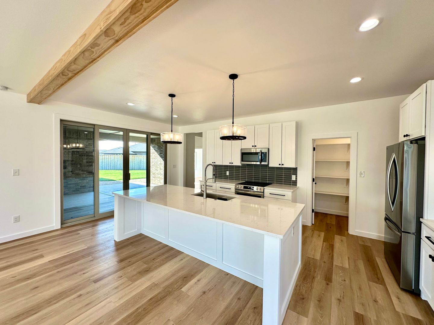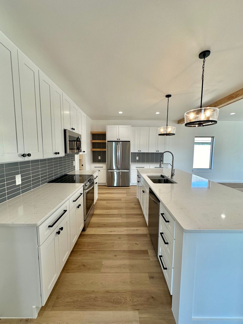 The kitchen doesn’t just open to the living space — it anchors it. A large island, modern finishes, and a walk in pantry create a space that’s equally suited for everyday living or hosting, all while maintaining a clean, elevated look.