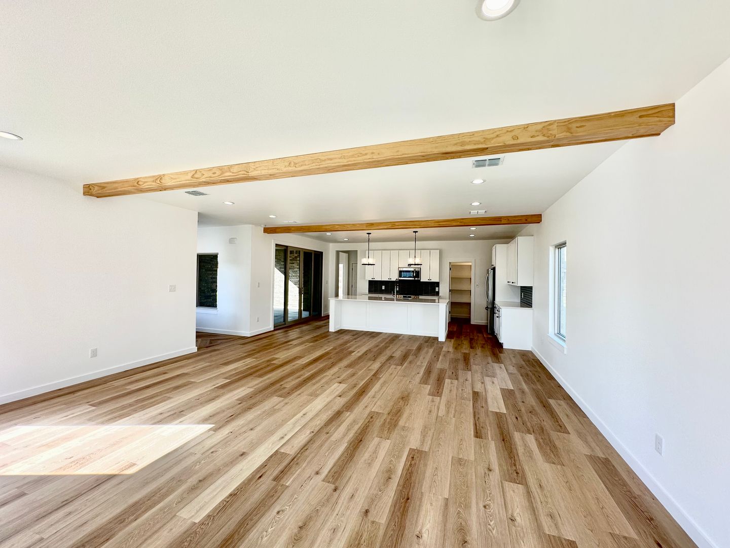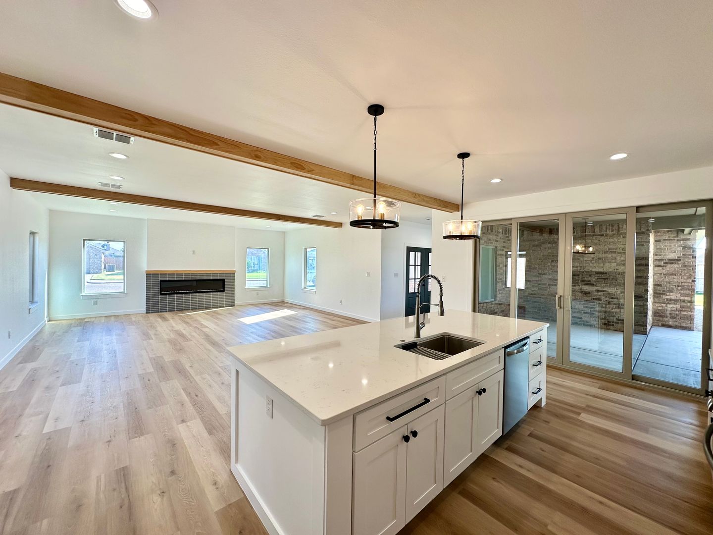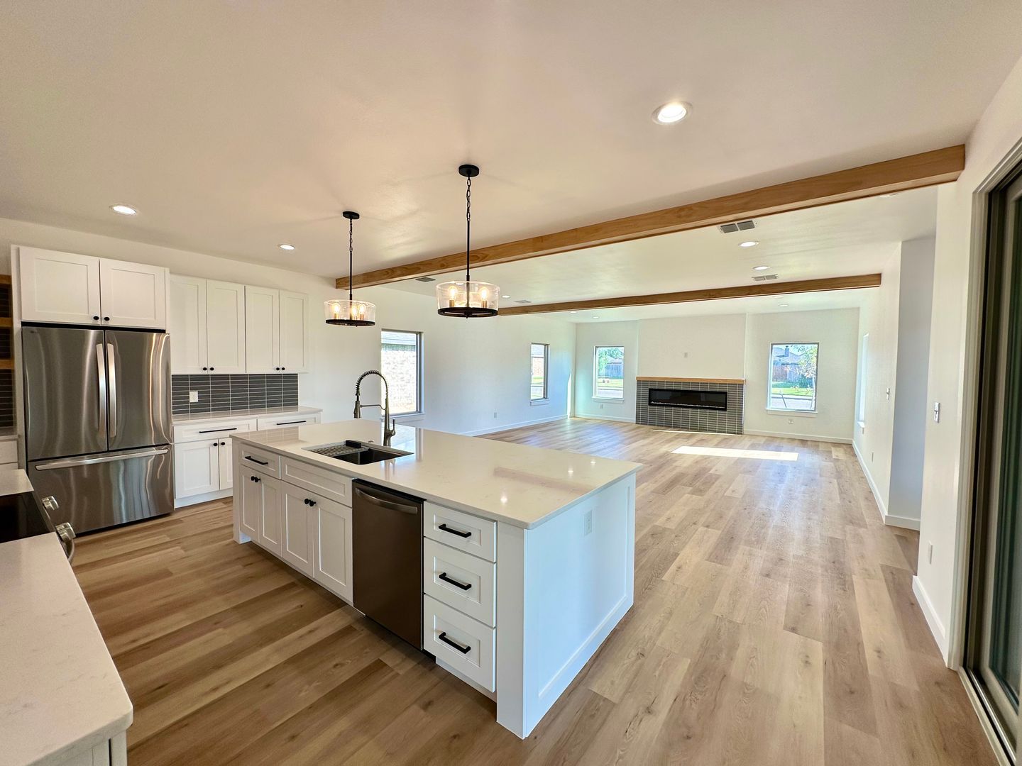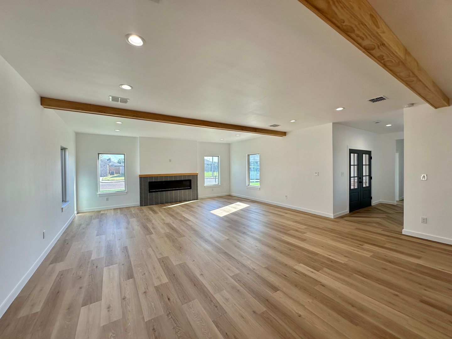 Instead of the typical open box floorplan, this home creates intentional separation without sacrificing flow. The main living area feels expansive and grounded, framed by warm wood beams, clean lines, and a sleek fireplace that brings just the right amount of presence.