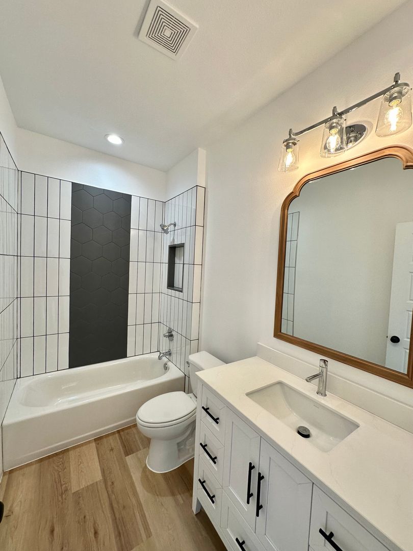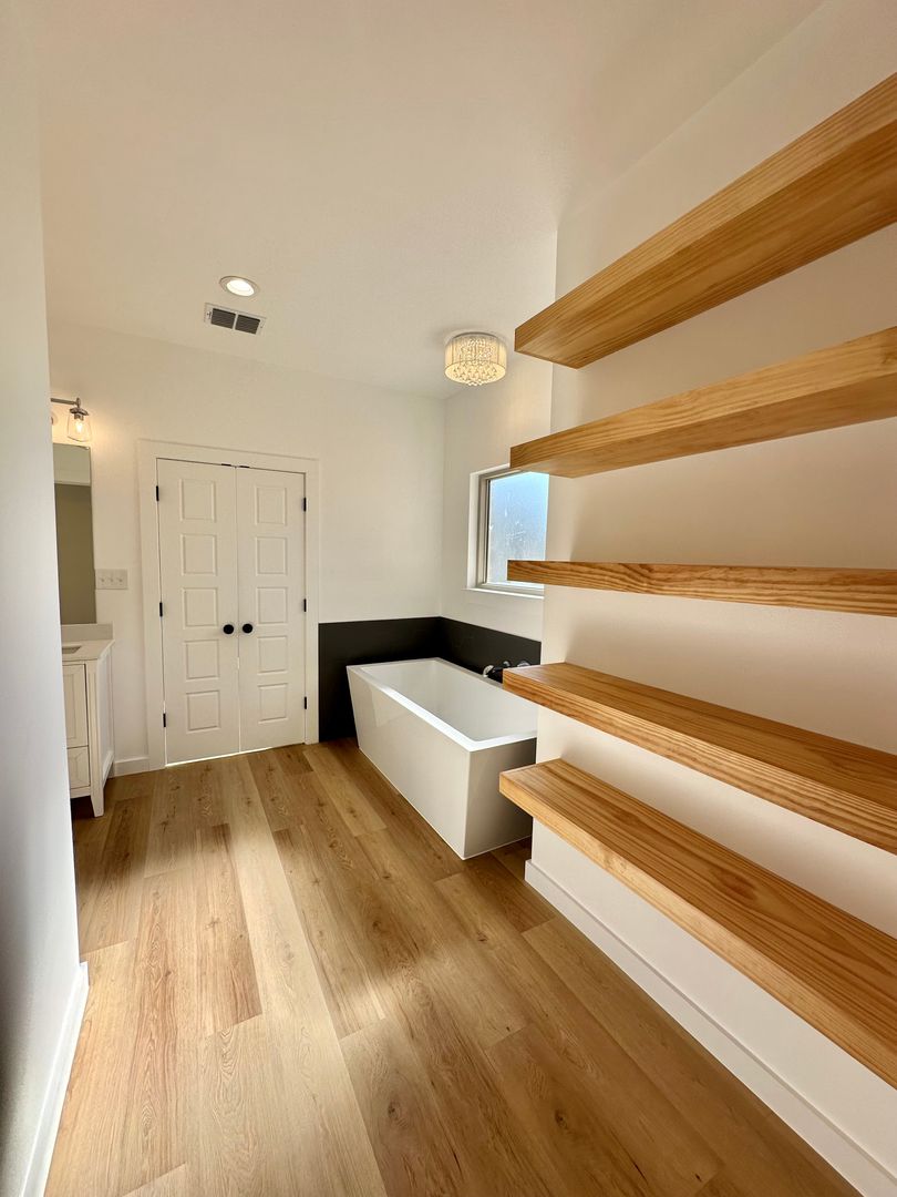 The primary suite is positioned for comfort and privacy, featuring a spa style bathroom with a freestanding soaking tub, oversized walk in shower, and a closet that actually keeps up with real life.